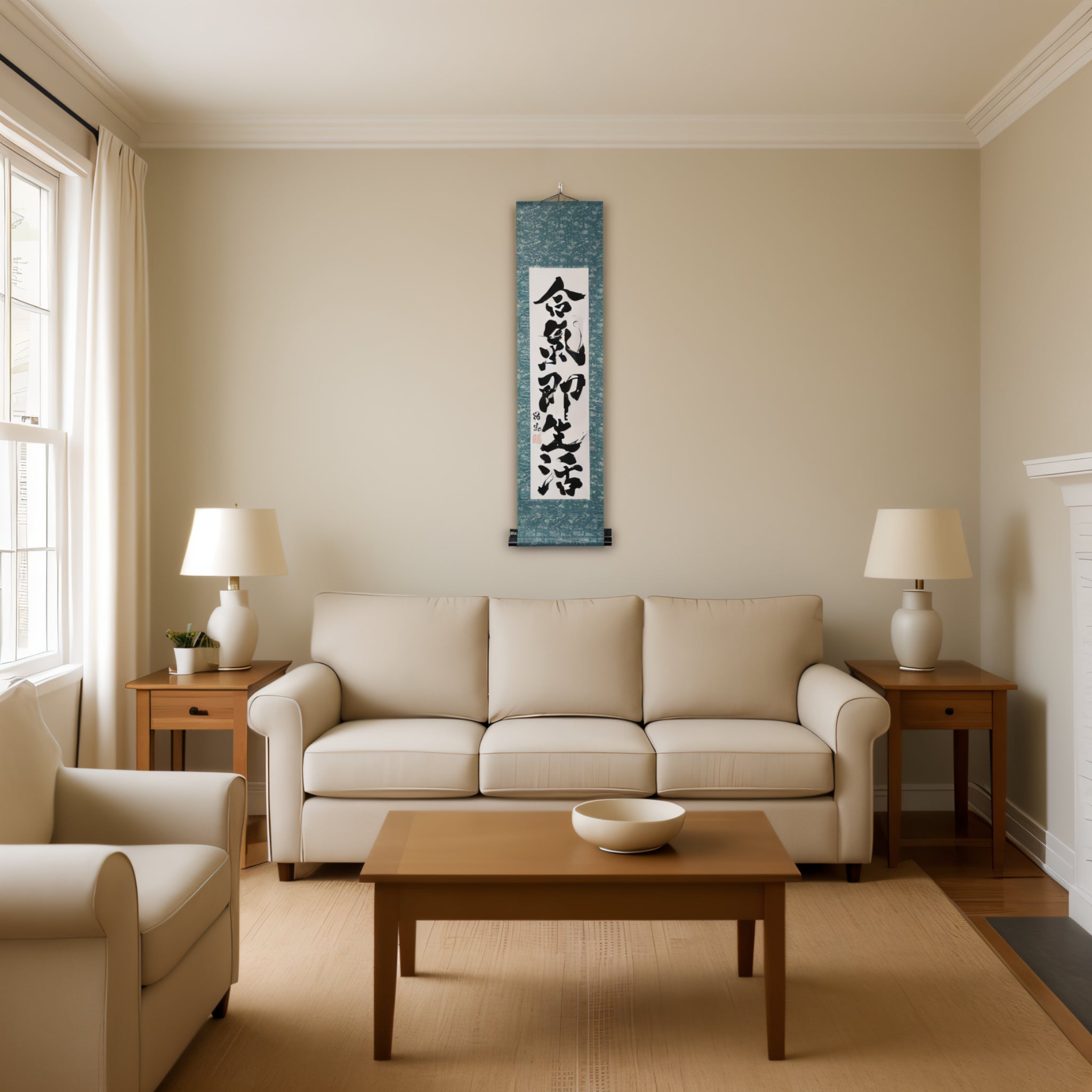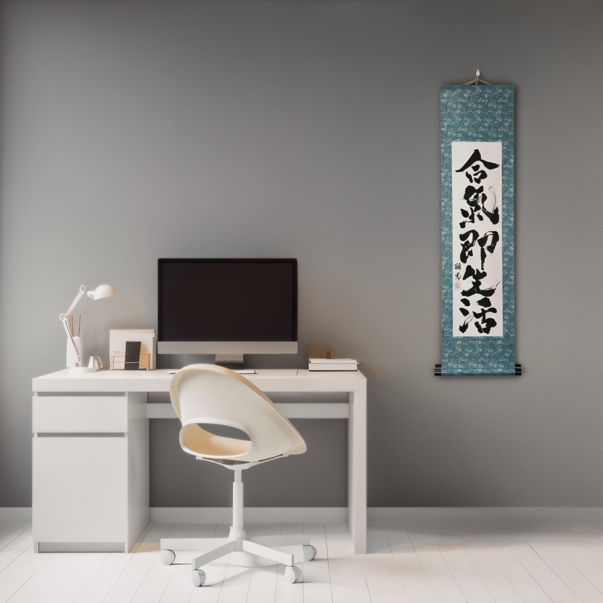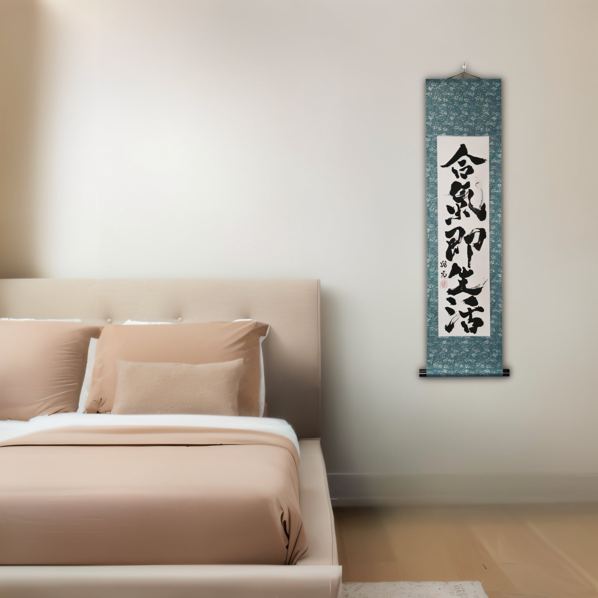 This Japanese calligraphy scroll features the profound phrase 合気即生活 (Aiki Soku Seikatsu) — "Aikido is daily life". It expresses a core principle of Aikido: the art is not confined to the dojo, but flows through every moment of our lives.
