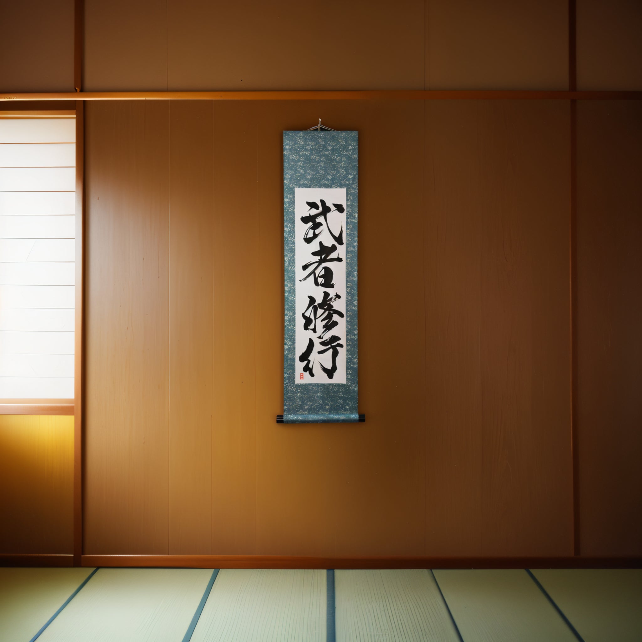 This Japanese calligraphy scroll embodies the essence of 武者修行 (Musha Shugyo) — the Samurai’s journey of self-discipline, growth, and mastery. Rooted deeply in the Samurai tradition, it represents a lifelong commitment to rigorous training and the pursuit of perfection in both skill and spirit.